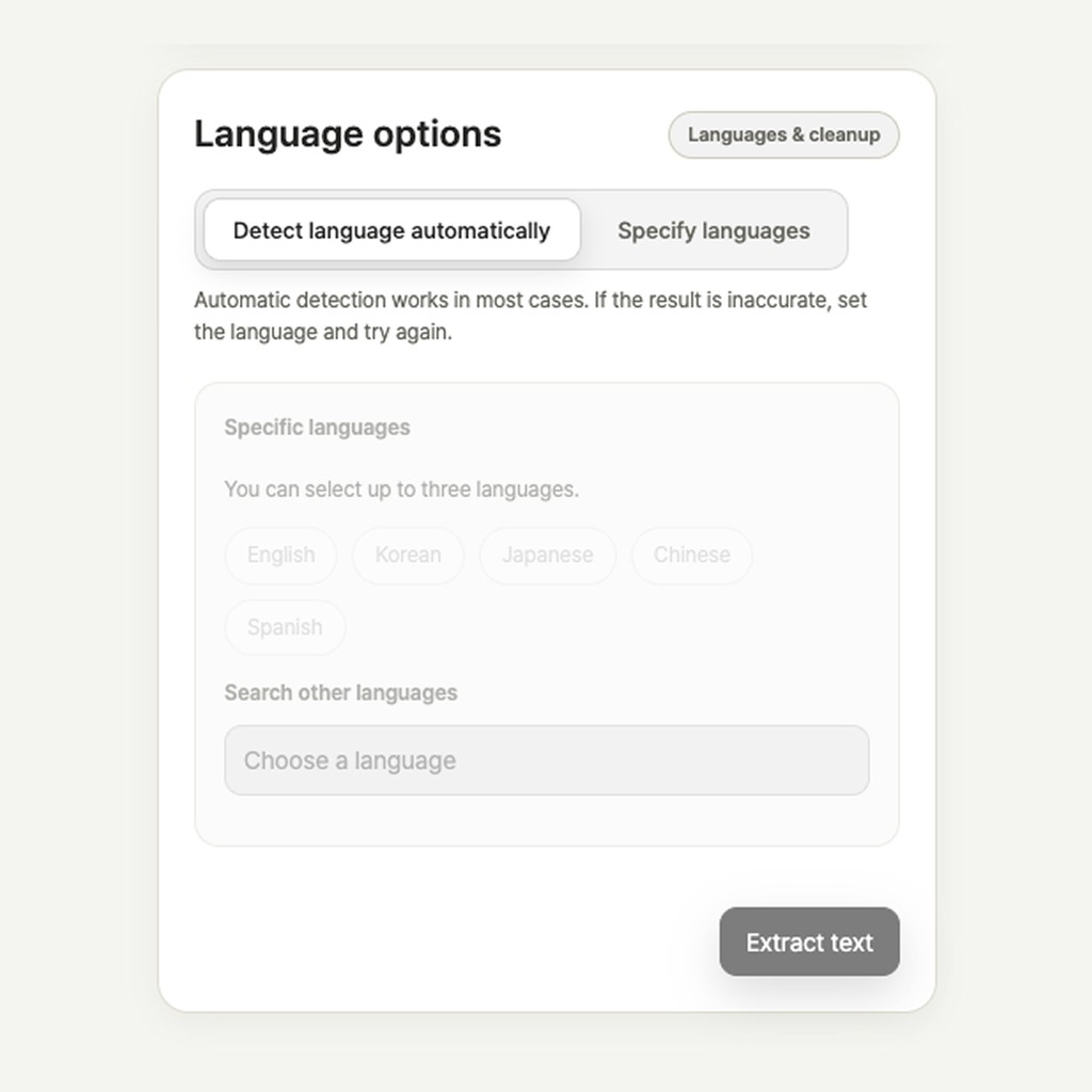 Textify automatically detects and extracts text from English, Korean, Japanese, Spanish, Chinese, and more.